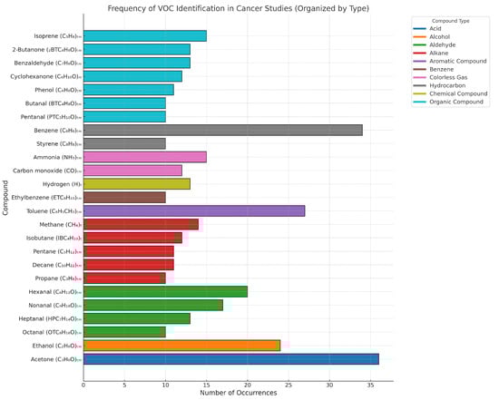 Figure 6 shows the frequency of VOC identification in cancer studies. Among these compounds, those associated with critical metabolic alterations stand out. Detailed information on all 120 studies, including compacted and relevant data, can be found in Appendix C. The compounds, those associated with critical metabolic alterations, such as acetone (), benzene (), and toluene (), were detected 36 (5.45%), 34 (5.14%), and 27 (4.08%) times, respectively. These recurrent VOCs are of interest as potential universal biomarkers due to their association with common metabolic processes, such as oxidative stress and disruptions in energy metabolism. Furthermore, compounds such as ethanol () and hexanal (), detected 24 (3.63%) and 20 (3.03%) times, respectively, may reflect specific metabolic disruptions with more specialized diagnostic applications. In an intermediate recurrence range, compounds like ammonia () with 15 detections (2.27%) and methane () with 14 detections (2.12%) suggest their potential involvement in relevant metabolic processes that, while not exclusive to cancer, could indicate significant biological alterations. Finally, less frequent compounds, such as pentanal (), styrene (), and butanal (), each detected 10 times (1.51%), are linked to specific metabolic contexts or rarer cancers. Despite their low recurrence, these VOCs could be critical in differential diagnoses and the early detection of cancer subtypes or initial stages of the disease.