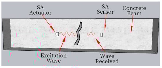 Lead zirconate titanate (PZT) is a commonly used piezoelectric material with a strong piezoelectric effect. Since PZT is a brittle material and is susceptible to the external environment, two marble blocks are used to package PZT, which can increase its service life without affecting the function of PZT material. Finally, the BNC joint is connected to form piezoelectric smart aggregates (smart aggregate, SA). From the aspects of design, materials, control, and practical application, the embedded piezoelectric smart aggregate is a reliable choice for structural monitoring in high-risk environments. Its comprehensive excellent characteristics and design advantages allow it to continue working normally even under the intense loads of an explosion []. SA is characterised by the piezoelectric effect, which can be divided into positive and inverse piezoelectric effects []. When the piezoelectric material is subjected to external load and deforms, polarisation occurs inside the material, and polarisation anomalous charge appears on the SA surface. This conversion of mechanical energy to electrical energy is called the positive piezoelectric effect. Conversely, applying an electric field to the material will create stress and strain on the material, and this conversion of electrical energy to mechanical energy is called the inverse piezoelectric effect. Then, using the piezoelectric effect of SA and the characteristics of embedding concrete structure, piezoelectric smart aggregate embedded in concrete can be used as a driver to generate stress waves or a sensor to receive stress waves. The piezoelectric smart aggregate SA1 is specified as the driving end and the aggregate SA2 as the receiving end of the signal. When the stress wave meets the damage, such as cracks in the structure during propagation, the energy of the stress wave will be attenuated, as shown in Figure 1. The monitoring signal selected was a swept sine wave with a frequency range from 100 Hz to 250 kHz, 125 k sampling points, and a signal duration of 1 s.
