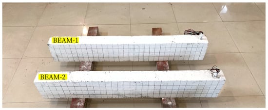 Two reinforced concrete beams were fabricated to study the flexural performance of RC beams under explosion load. The specimens are made of C40 strength-grade concrete and 42.5-grade ordinary Portland cement. The concrete mix ratio design is shown in Table 1 according to JGJ55-2011’s “Common Concrete Mix Ratio Design Regulations”[]. After curing for 28 days under specified conditions, the cured reinforced concrete beams are shown in Figure 3, numbered Beam-1 and Beam-2, respectively.