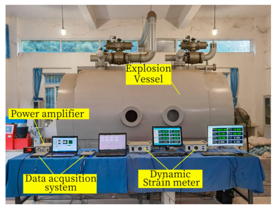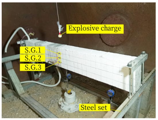 To compare the flexural performance before and after the explosion load, the explosion test only causes explosion pre-damage to Beam-1, and the equipment required for the explosion test is shown in Figure 4. The explosion test was carried out in the laboratory explosion vessel. The steel support fixed the specimen beam to reasonably simulate the boundary conditions of both ends of the beam. Explosives of 100 g TNT equivalent were used in the test, and the explosives were suspended 100 mm above the centre of the detonation surface of the RC beam. A millisecond detonator was used to detonate, as shown in Figure 5. At the same time, to monitor the beam’s dynamic response, three concrete strain gauges are arranged at the side of the beam every 50 mm, numbered S.G.1, S.G.2, and S.G.3 from the top of the beam to the bottom of the beam.
