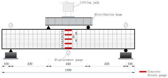 After the explosion test, the bearing capacity test of Beam-1 and Beam-2 is carried out. The bearing capacity test equipment is shown in Figure 6. In this test, the flexural performance is studied as four-point loading. The actuator transmits the force to the distribution beam, and then the distribution beam transmits it to the specimen beam. The transmission line connected to the actuator transmits the load data to the computer in real time. It adopts the form of hierarchical loading, and the whole loading rate is controlled at 0.1 kN/S. The load control mode is adopted in the initial stage, with each loading 5 kN. After the specimen cracks, the load of each stage is increased by 10 kN. When the load reaches 0.8 times the calculated value of ultimate bearing capacity, the load grade is encrypted, and each grade is 5 kN until the specimen is damaged. According to GBT50152-2012, the “Standard for Test Methods of Concrete structures”[], one of the following phenomena occurs that is when the concrete in the compression zone is crushed and collapsed, the mid-span bending deflection reaches 1/5 of the span or the main crack in the tension zone reaches 1.50 mm and the beam body is judged to be damaged. Five concrete strain gauges are arranged in the beam’s side span from the top to the bottom every 50 mm to monitor the concrete strain on the beam side. The numbers are A1, A2, A3, A4 and A5 from the top to the bottom of the beam. The mid-span deformation was obtained by analysing the data change in the displacement meter, and a displacement meter was placed at the span and two supports, respectively, as shown in Figure 7.