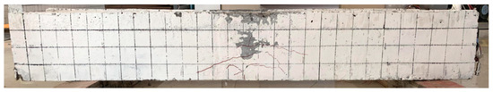 After the explosion test, the explosion damage of Beam-1 is shown in Figure 8. Part of the white layer on the blasting surface is washed off, and the concrete at the edge is slightly peeled off. In the middle area of the side span, there is a top-down penetrating crack and seven oblique cracks, which are roughly symmetrical distributions. The overall damage degree of the specimen beam under the action of explosion load is not large.
