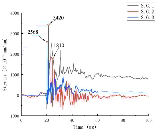 Figure 9 shows the time–history curve of the dynamic strain of concrete on the sides of three beams. The analysis of the results shows that, compared with the peak strain values of the three concrete strain gauges, the peak strain values of S.G.1 and S.G.2 are 1.89 times and 1.42 times those of S.G.3, respectively, and the peak strain values of concrete gradually decrease from near the explosion facing surface to near the back explosion surface. The further the distance from the explosion source, the smaller the tensile stress of the concrete and the smaller the deformation.