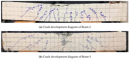 Figure 11 shows the crack development of Beam-1 and Beam-2 after the bearing capacity test. By comparing Figure 11a,b, it can be seen that the number of cracks in beams without explosion damage (Beam-2) is more than that of beams with explosion damage (Beam-1) because the explosion load causes cracks in Beam-1. As the load of bearing capacity test increases, the initial crack from the explosion will develop rapidly, the concrete in the compression zone will be crushed faster, and the structure will fail. The ultimate bearing capacity of the concrete in the compression zone of beams without explosion damage is larger, which indicates that the bending bearing capacity of the beams is degraded by explosion load.