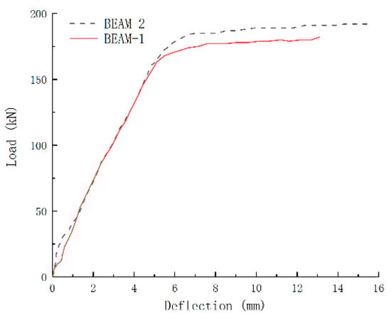 The load–deflection curve of the specimen beam is shown in Figure 12. The experimental results showed that the bearing capacity of the undamaged beam, Beam-2, was 197.8 kN, whereas the remaining bearing capacity of the beam Beam-1, after being subjected to an explosion, was reduced to 166.9 kN. This significant loss in bearing capacity highlights the destructive impact of explosion loads on reinforced concrete beams. By comparing the load–deflection curves of two specimen beams, it can be seen that the development law of deflection of specimen beams is similar. During the initial loading process, the mid-span deflection of Beam-1 under the same load is larger than that of Beam-2. Compared with the initial slope of the curve, it can be concluded that the initial section bending stiffness of Beam-1 is 50.3% of that of Beam-2, indicating that the explosion load weakens the initial section stiffness of the flexural member to a certain extent. In the failure stage, the final deflection of Beam-1 is reduced by 16.0% compared with Beam-2, which can prove that the flexibility of Beam-2 is better than that of Beam-1, and the plastic behaviour of reinforced concrete beam is more obvious after explosion damage.