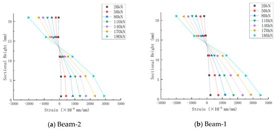 The concrete strain distribution along the interface height under different loads is shown in Figure 13. From the concrete strain distribution curve of Beam-2, it can be seen that the strain distribution section of concrete at 20 kN conforms to the assumption of a plain section, and the linear relationship of strain is good. With the continuous increase in the load, the lower concrete cracks and gradually exits the work, and the position of the neutral axis begins to shift upward at 50 kN, and the relative height of the compression zone gradually decreases. At each stage of loading in the later stage, it can be observed that the height of the relative pressure zone is reduced further, and the neutral axis is moved further up until the component completely fails and is destroyed. Compared with Beam-2, it is found that the neutral axis of Beam-1 has shifted upward since the initial loading because the explosion load has caused certain damage to the entire concrete structure. Once the load is loaded, these damaged micro-cracks will quickly go through and crack, resulting in the neutral axis’s upward movement and the compression zone’s reduction during the initial loading process.
