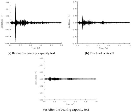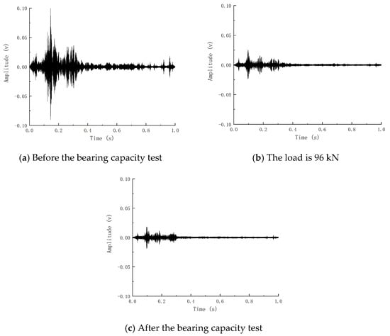 Figure 14 shows the time history curve of the piezoelectric signal waveform before and after the bearing capacity of Beam-2. It can be seen that the signal before the bearing capacity is fuller, and the piezoelectric signal gradually weakens with the increase in load. In contrast, the signal after the bending failure of the member is greatly reduced in terms of amplitude and energy, indicating that the member’s failure will significantly weaken the piezoelectric signal. The signal waveform time history curve of Beam-1 before and after static pressure is shown in Figure 15. The development of the piezoelectric signal of Beam-1 is different from that of Beam-2. Before static pressure, the receiving end of Beam-1 can still receive a certain intensity signal. The signal is enhanced because the concrete microcracks in the compression zone created by the explosion are constantly squeezed and closed during load increase. To a certain extent, the cracks in the concrete are reduced, and the piezoelectric signal is strengthened. After that, the signal began to decline rapidly until the component was destroyed, and the signal disappeared.