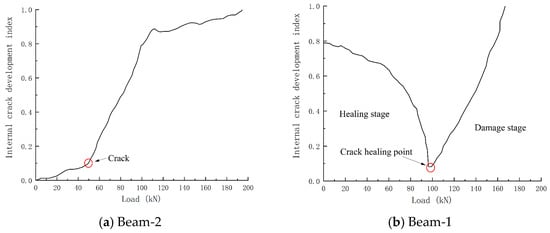 After the piezoelectric signal was processed by the wavelet packet analysis method, it was converted into the internal crack development index-load curve under continuous loading during the test process, as shown in Figure 16. The damage curve of Beam-2 is regarded as three stages: the beam is healthy before static pressure, and the internal crack development index changes gently in the initial stage, when the beam is in the elastic stage. After reaching the cracking load, the internal crack development index has a relatively obvious steep decline, called the crack development stage. When the generation and development of cracks reach a certain extent, it is mainly due to the expansion of crack width. The growth rate of the internal crack development index tends to be flat until the bearing capacity of the member is completely lost. The damage index becomes 1, and the signal of Beam-1 is different from that of Beam-2. The damage development of Beam-1 can be regarded as two stages: the healing and failure sections. The crack development index in the healing section will gradually decrease to 0. The crack development index in the failure section will rapidly develop to 1. The turning point of the crack development index is defined as the crack healing point, and the appearance of the crack healing point corresponds to the piezoelectric signal amplitude increasing to the maximum immediately. From the internal crack development curve, it can be seen that the crack healing point of Beam-1 appears at 96 kN, and its residual flexural bearing capacity is 166.9 kN. In the test, the appearance of the crack healing point means that 57.52% of the ultimate load has been reached, and the appearance of the crack healing point means that the internal damage of the member will develop rapidly until the failure of the member. The fracture healing point of the damaged component can predict the damage of the component in advance and give a warning.