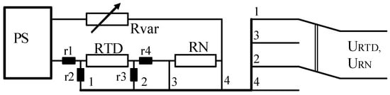 The voltage divider circuit for measuring the RTD resistance [17,18], presented in Figure 1, has the best metrological properties. The power supply (PS) should ensure short-term stability (during a series of measurements of voltage drops across the resistor RN and the RTD) and a low level of noise. The variable resistor Rvar is used to adjust the current in the circuit in such a way as to ensure voltage drops across RN and RTD close to the upper limit of the measurement range of ADC to minimize quantization error. In this circuit, the RTD’s resistance RRTD is calculated on the basis of the measurements of the voltage drops URTD across the RTD and the voltage drop URN across a reference resistor whose resistance is equal to RN [17,18]. The lead wires r1 … r4 in the chosen four-wire circuit do not have any effect on the accuracy of measurements.