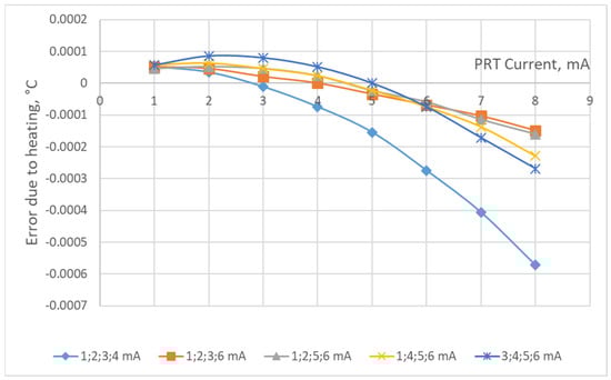 As demonstrated by the results of the conducted research, correcting the error caused by the heating of a platinum resistance thermometer (PRT) by its operating current can substantially reduce the influence of this error on the final temperature measurement results. Only under certain conditions is the reduction less effective. For instance, Figure 2 shows the error due to self-heating versus ADC noise and interference. We estimate the error due to self-heating to be 0.008 °C when using the ADC of AD7714. From Figure 3, Figure 4, Figure 5 and Figure 6, it can be seen that the residual error due to self-heating after correction does not exceed 0.0002 °C for measurement currents below 5 mA. The residual error after correction is about 0.001 °C for the worst case, i.e., when the measuring current is 8 mA and the error is estimated due to self-heating with currents of 2,3,4,5 mA (see bottom right corner of Figure 5). In all other cases, the reduction can be by a factor of ten or even more, which is a significant improvement in measurement precision. By applying certain methods, such as the least squares method, the residual, non-excluded error from PRT heating can be further minimized. This method allows for the error to be reduced to levels that are even smaller than the noise level of the analog-to-digital converter (ADC), which is an impressive outcome in precision measurement. Importantly, achieving this level of correction typically requires only five measurements. Increasing the number of measurements beyond this may only be necessary in specific, individual cases, depending on the particular measurement environment or accuracy requirements.