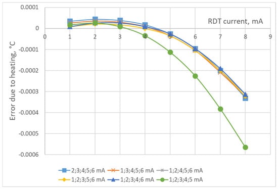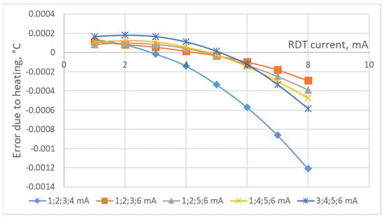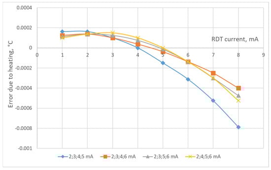 But the above figures are correct only without consideration of the error due to heating of the RTD by the operating current. According to [23], this error should not exceed if the power dissipated by the platinum RTD is . The power dissipated by the platinum RTD depends on many factors, such as the operating current IRTD, the sensitivity of the ADC (more precisely, its noise and the residual level of interference UNZ), and RTD sensitivity . In [24], the optimum RTD current IRTD was determined. With this current, all contributions of the influencing factors listed above are equal, i.e., their total influence is minimal
