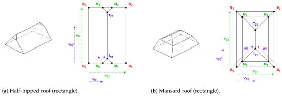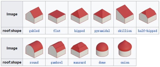 When the “orientation” property is not given, the default value will be “along” for gabled roofs and “across” for gambrel. The rest of the definitions of the roof shapes in Figure 8 and Figure 9 are obtained in Table 3.