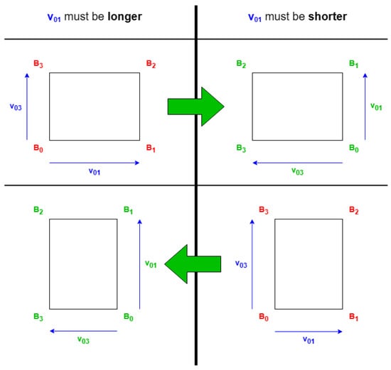 The following algorithms locate most of the upper coordinates on the roof near the first side (between the first two coordinates) and its corresponding opposite side. To meet the concept of roof shapes, these algorithms require that the first side be one of either the shorter or the longer sides, contingent upon the shape and probable properties. To satisfy this, if the provided coordinates are not arranged in a manner that conforms to this requirement, a positional shift can be performed on the coordinates. This shift involves treating the first point as the last and the second as the first (see Figure 3).