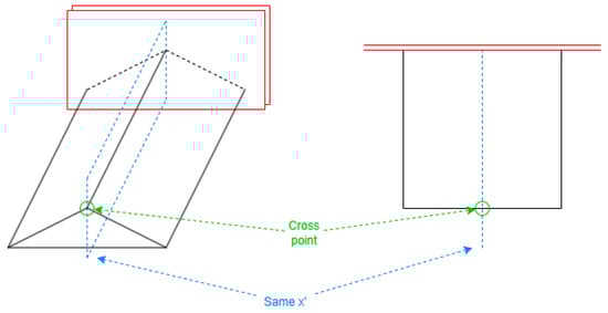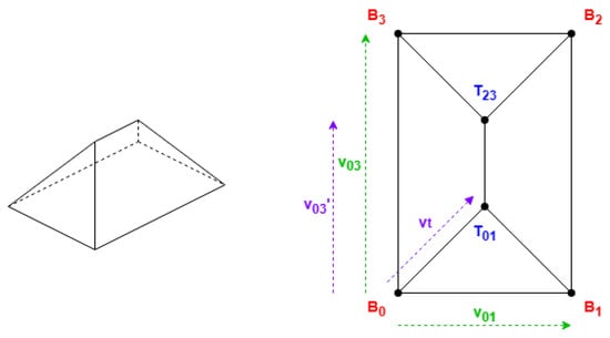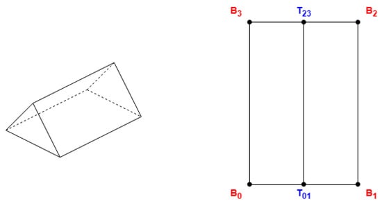 In Table 1, the points represent XY coordinates for the base points given in OSM coordinates, being the body side of the building. The points T and are the top points, with only XY coordinates. A dot over an uppercase letter means a 3D point with the same XY coordinates as the corresponding 2D point and the proper height of the base (for ) or top (for T or ) up to Equation (1).