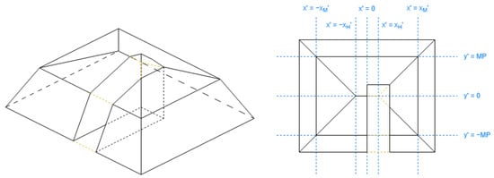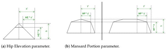 In Table 2, there are used the parameters Hip Elevation (HE) and Mansard Portion (MP); these are algorithm parameters defined for the half-hipped and mansard shapes, respectively. Their visualizations are displayed in Figure 7.