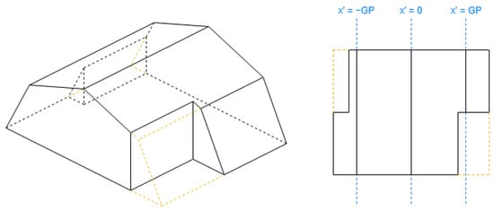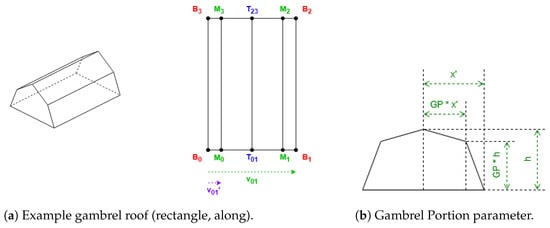 An algorithm parameter Gambrel Portion (GP) is used for the gambrel roof (Figure 9b), which determines the length fraction in the coordinates where the raised edge should be situated on both hips. Its value must be between 0.5 and 1. When GP is equal to 0.5, the result will be equal to a gabled roof; when GP is equal to 1, the result will be equal to a flat roof. The recommended value is 0.7.