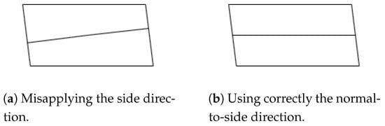 These roof shapes in Figure 8 and Figure 9a have a property “orientation”. Its value can be “along” or “across”. When it is “along”, the algorithm requires the first side to be shorter, and when it is “across” to be longer.