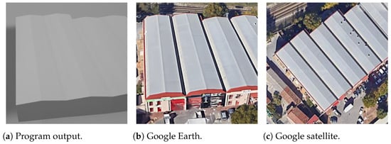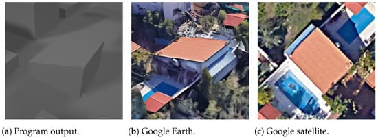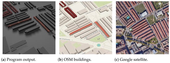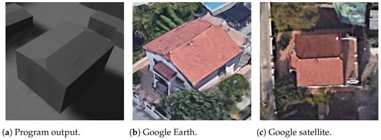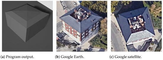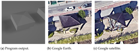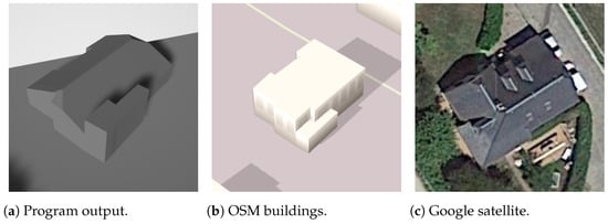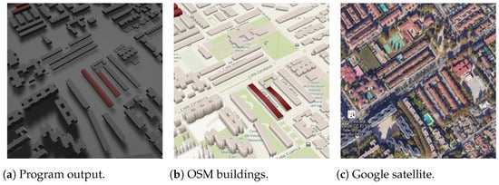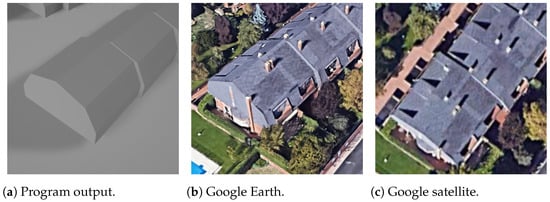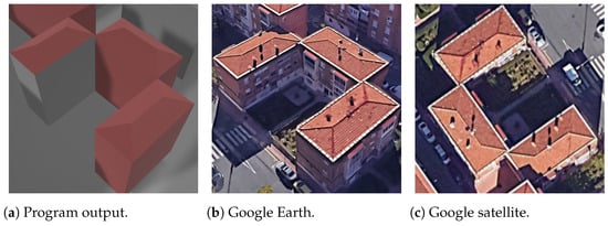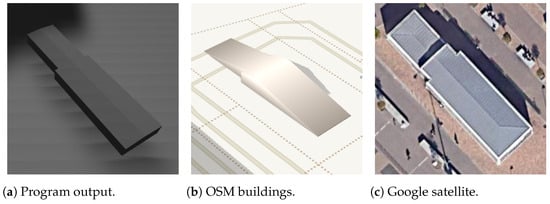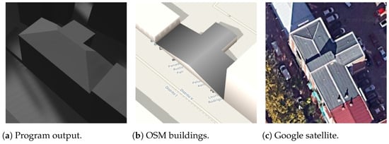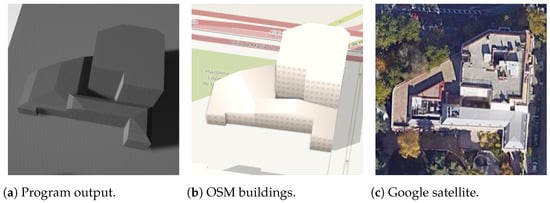 The work of Župan et al. [] is an example of mixing LiDAR data with OSM, which applies fills to required missing attributes, focused on roof heights and basic shapes distinguished (between flat, pitched, or gabled), including detailed inspection of them with Google Earth, showing results of only automatic procedures and after manual improvement. Finally, a comparison with Google Earth is conducted to assess the outcomes.