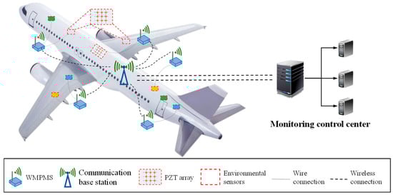 The overall architecture of the multi-parameter monitoring of ASS is shown in Figure 1. This architecture mainly contains sensor networks, WMPMS, a communication base station, and a monitoring control center []. The proposed architecture can be used to collect essential information about the structural health status and service environment, and it is thus capable of guiding maintenance and ensuring flight safety.