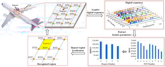 The impact monitoring of aircraft structures is a typical passive structure health monitoring method. A monitoring method based on piezoelectric-guided waves is widely used because of its high sensitivity and regional monitoring. When an external impact occurs on the surface of the structure, a stress wave (defined as impact signal) is generated and propagated from the impact location to the perimeter of the structure. An impact signal is a kind of guided wave signal, and its energy decreases as the propagation distance increases. So, the closer the PZT sensor feels its position is in relation to the impact, the stronger the guided wave energy, and the greater its response will be. And in general, the closer sensors receive the impact signal earlier. By analyzing the arrival sequence and energy size of the impact signals obtained by PZT sensors at different positions, the impact monitoring results are obtained by combining a specific algorithm [,].