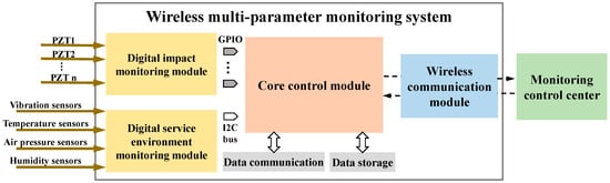 The hardware architecture of the WMPMS is shown in Figure 3, which contains four modules, including a digital impact monitoring module, a digital service environment monitoring module, a core control module, and a wireless communication module. The digital impact monitoring module is connected to the PZT array, converts the impact response signals into digital sequences, and uploads them to the core control module. The digital service environment monitoring module is connected to digital sensors and uploads the obtained environmental signals to the core control module. The core control module uses the Apollo 2 microcontroller with ARM cortex M4 core, which has high integration and ultra-low power consumption compared to FPGA and DSP. It is responsible for collecting multi-parameter monitoring signals, calculating monitoring results, and storing and transmitting them to the monitoring control center through the wireless communication module.