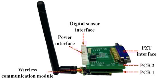 The developed WMPMS is shown in Figure 4, and it consists of two layers of PCBs and wireless communication modules. PCB 1 mainly integrates the core control module, and PCB 2 integrates the digital impact monitoring module, digital business environment monitoring module, PZT interface, digital sensor interface, and power supply interface. The two PCBs and the wireless communication module are connected to each other by row pins. Without the wireless antenna, the overall size is 45 mm × 50 mm × 30 mm.