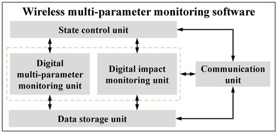 Based on the hardware design of the WMPMS, the corresponding embedded software is also developed to control the system, including switch of working state, signal acquisition, processing, storage, communication, etc. Among the multiple parameters that the system monitors, impact is a random event whose monitoring uses a triggering mechanism, and when an impact event occurs, the system is triggered to respond. As for environment monitoring, apart from vibration that should be continuously monitored, temperature, humidity, and air pressure can be monitored in fixed time intervals. According to the function requirements mentioned above, the software of the multi-parameter monitoring system contains five components, including a state control unit, a digital impact monitoring unit, a digital service environment monitoring unit, a data storage unit, and a and communication unit, as shown in Figure 5.