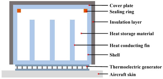 The architecture of the thermoelectric conversion unit is presented in Figure 6, which can be divided into a TEG and a heat storage structure. The upper end and lower end of the TEG are connected to the heat storage structure and the aircraft skin, respectively. When there exists temperature difference between the two ends of the TEG, it can generate electric power. Therefore, the key to thermoelectric conversion is ensuring a temperature difference between the heat storage structure and the aircraft skin exists.