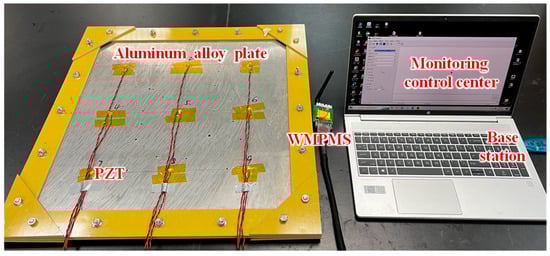 The impact monitoring verification is performed on an aluminum alloy plate with dimensions of 600 mm × 600 mm × 3 mm (Length × Width × Thickness), as shown in Figure 7. A total of nine PZTs numbered from 1 to 9 are arranged on the structure and connected to the WMPMS. The four impact monitoring regions are formed, and the size of each region is 200 mm × 200 mm. During the verification process, 50 impact events are equally applied across the four regions by an impact hammer. Once an impact occurs, the system is awakened, converting the impact response signals of the nine PZTs into digital sequences, locating the impact region, and uploading the localization results to the monitoring control center through wireless communication, which is simulated by a laptop with a base station.