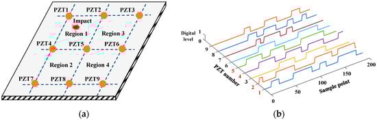 Example of impact monitoring: (a) impact occurring in region 1; (b) digital sequences.