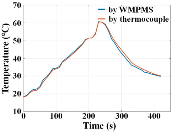 The experimental setup of the temperature monitoring verification is shown in Figure 9b, in which the WMPMS connects a digital temperature/humidity sensor SHT30 to monitor the environmental temperature, and a thermocouple temperature sensor is adopted as a contrast. During the experiment, the SHT30 sensor and the thermocouple are first heated slowly from room temperature to about 60 °C using a heat gun, then, they are cooled back to room temperature. Figure 11 shows the temperature variation curves of the system and the thermocouple, which basically overlap with each other and represent the accuracy of the temperature monitoring of the WMPMS.