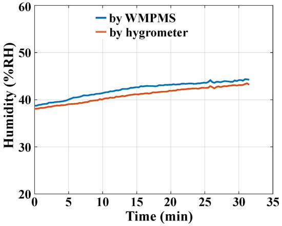 As for the humidity monitoring verification, a hygrometer is placed together with the above-mentioned SHT30 sensor, and it is used as a reference, as shown in Figure 9c. During the experiment, the environmental humidity is controlled to rise slowly by using an air conditioner. Along with the humidity rise, the monitoring results of the system and the hygrometer are both recorded every 15 s, as shown in Figure 12. The monitoring deviation between the system and the hygrometer is about 1%RH, and the maximal relative error is only 2.4%, which is normally acceptable when performing humidity measurements with different sensors. Therefore, the developed WMPMS is capable of reliably monitoring environmental humidity.