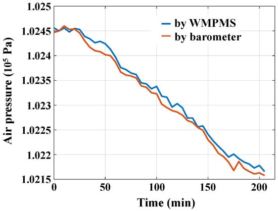 Finally, the air pressure monitoring verification is performed. As shown in Figure 9d, the WMPMS is connected to a digital air pressure sensor BMP280 to monitor pressure variation. Similarly, a standard barometer is adopted as a reference. During the experiment, both the multi-parameter monitoring system and the barometer record the current air pressure every 5 min. The whole monitoring process lasts for about 4 h, and the monitoring results are given in Figure 13. The experimental results show that the maximum deviation of air pressure values monitored by the system and the barometer does not exceed 22 Pa, which verifies the ability of the developed multi-parameter monitoring system to accurately monitor air pressure.