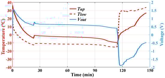 During the verification, the temperature of the thermoelectric generator’s lower surface, which is labeled as Tlow, is controlled to gradually decrease from room temperature to about −10 °C and then increase to about 30 °C. Figure 16 shows the changing process of Tlow, the temperature of the upper surface Tup of the thermoelectric generator, and its output voltage Vout. It can be seen that when the TEC starts to cool, Tlow decreases rapidly, while Tup changes much slower due to the heat storage material. Therefore, Tup is higher than Tlow. At the same time, Vout starts to grow from zero, since the value of Vout depends on the temperature difference between Tup and Tlow. After about 110 min of cooling, the TEC switches to heating mode and Tlow increases rapidly, making the difference between Tup and Tlow decrease, and then, Tlow gradually exceeds Tup. Accordingly, Vout starts to decrease and then increase again in an opposite direction. During the whole process, the output voltage is consistent with the temperature difference, the value of which basically stays above 0.5 V and reaches a maximum of 2 V.