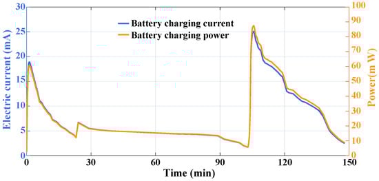 The output voltage of the thermoelectric generator is connected to the power management unit of the multi-parameter monitoring system. By measuring the working current of the system when powered by the energy self-supply module, the output power can be calculated, as shown in Figure 17. The maximum energy harvest power occurs when the temperature difference between Tlow and Tup reaches the maximum value. At this time, the maximum current and power are 25.1 mA and 87.5 mW, respectively, and the maximum power value is much higher than the power consumption value of the system. According to the measurement results in Figure 16, the total energy that can be recovered in one flight mission is 296.4 J, which can allow the system to operate for 11 h. Therefore, with the energy self-supply module, the multi-parameter monitoring system is capable of continuously working onboard without an external energy supply.