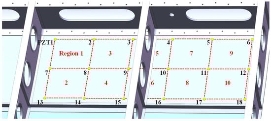 The experimental setup of the multi-parameter monitoring of the composite UAV wing is shown in Figure 18. The multi-parameter monitoring system is fixed on the wing rib and used to monitor impact events and the environment of the wing structure. Figure 19 shows the PZT placement in the impact monitoring area, which contains 18 PZTs and forms 10 monitoring regions. The PZTs are attached to the inner surface of the wing, surrounded by complex structures like the wing rib, stiffener, and wing spar. The 10 regions are labeled from region 1 to region 10, and they are the same size, 170 mm × 150 mm. During the experiment, the system is woken up every 10 s for environment monitoring and is triggered to respond whenever an impact occurs. For environment monitoring, it should be noted that only temperature, humidity, and air pressure are monitored, and vibration is not considered in this experiment due to the limitations of the experimental setup.