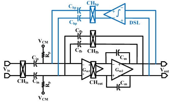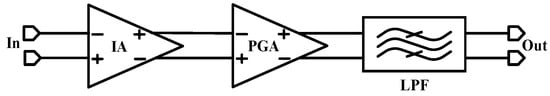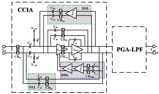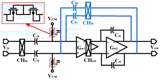 The typical architecture of an analog front-end for biopotential signal acquisition is shown in Figure 1, and mainly consists of three modules: an instrumentation amplifier (IA), a programmable gain amplifier (PGA), and a low-pass filter (LPF). The instrumentation amplifier is a key module that determines the performance of the analog front-end, and various related topologies have been proposed. The classical three-opamp topology can achieve high input impedance, high CMRR, and gain accuracy []. However, the three-opamp structure limits its power efficiency compared to other single-opamp solutions. For the current feedback instrumentation amplifier, the transconductance of the input transconductor can vary with a large input common mode (CM) range, thus reducing gain accuracy []. Recently, to eliminate the various trade-offs associated with resistive feedback, CCIA has been proposed to realize a wide input CM range and high gain accuracy []. Thus, the capacitively coupled structures are more suitable for designing analog front-ends for biopotential signal acquisition.