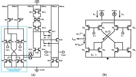 To obtain a gain accuracy of at least 0.1%, the open-loop gain of the amplifier needs to be higher than 100 dB; therefore, Gm1 selects a two-stage Miller-compensated operational amplifier, as shown in Figure 4a. The op-amp adopts a two-stage amplifier structure, with the first stage using a folded cascode structure to provide a higher gain. The second stage uses a common-source stage to provide an additional gain as well as a large output swing. Also, Gm1 contains two chopper switches, CH1 and CH2; CH1 is located at the source of M15 and M18, and CH2 is located at the drain of M11 and M12.The input stage of Gm1 employs a transconductance-boosting technique to increase the equivalent transconductance of the circuit [].