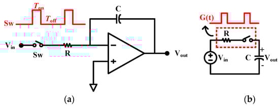 To simplify the analysis, assuming that RC ≫ DT, where T is the clock period driving the switch in Figure 6b, Vout(ω) is a low-frequency signal, and the last term in Equation (16) can be approximated as 0. Assuming that Vin(ω) is also a low-frequency signal and that |ω| > ω0/2, Vin(ω−kω0) can be ignored as well. Since g0 = D/R, Equation (16) can be simplified to