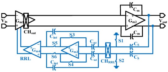 A negative feedback loop RRL is designed to suppress the output high-frequency ripple; its circuit structure is shown in Figure 7. The RRL mainly consists of a sampling capacitor CS, a chopper switch CHRRL, an integrator composed of a transconductance amplifier Gm3, and a transconductance amplifier Gm4. The high-frequency ripple at the output of the op-amp is converted to current by capacitor CS and then demodulated to low-frequency ripple current by the chopper switch, and the integrator composed of Gm3 continuously integrates the demodulated low-frequency ripple and is finally converted to current by transconductance amplifier Gm4, to be fed back to the input stage of the first-stage transconductance amplifier of the main op-amp, which is offset with the current generated by the op-amp detuned voltage at the input stage of the main op-amp to realize the elimination of the ripple.