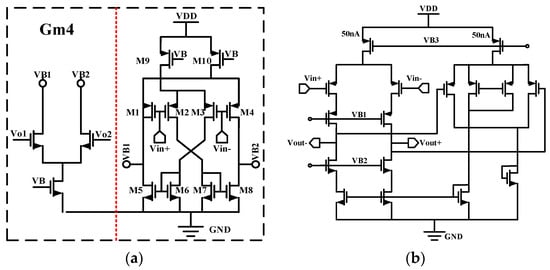 Agm3 represents the DC gain of the transconductance amplifier Gm3. To avoid the impact of high-frequency ripple on the output signal, the suppression of the transmission ripple needs to reach at least 40 dB. Therefore, Gm3 is designed as a single-stage telescopic structure for the input of PMOS transistors, as shown in Figure 8b, with a total current consumption of 100 nA. At such a low current, the DC gain of the single-stage telescopic amplifier is also relatively large enough to meet the demand for ripple suppression with low power consumption.