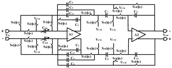 The schematic of the PGA-LPF circuit used in this paper is shown in Figure 9. It is mainly composed of operational amplifiers A1 and A2, switch S1~S22, capacitors C1~C10, and input capacitors Cin1,2. The switches are controlled by a non-interleaved clock. A capacitive feedback network is added to the capacitive low-pass filter, and the gain is adjustable by adjusting the capacitance, thus constituting a combination circuit of PGA and LPF. The structure uses a fully differential structure to improve the overall common mode rejection ratio of the circuit.