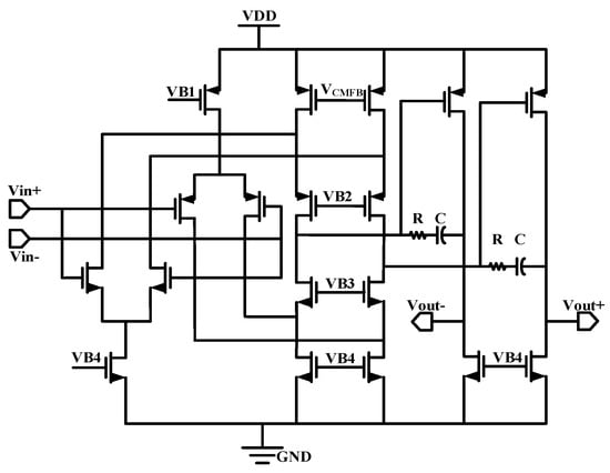 Since the process of charge transfer, as well as sharing in switched-capacitor circuits, is affected by the gain and the bandwidth of the op-amp, the op-amp needs to have a sufficiently high gain to avoid affecting the circuit’s accuracy. As shown in Figure 10, the core amplifier in the PGA-LPF module uses a fully differential two-stage transconductance amplifier with rail-to-rail input. The first stage of the amplifier utilizes a P-NMOS complementary structure to increase the circuit input swing and a cascode structure to increase the circuit gain. For the second stage, a common source stage circuit is used to increase the output swing of the amplifier.