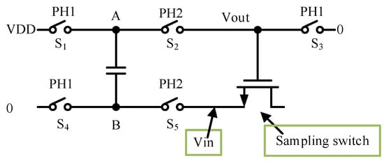 The noise of the PGA-LPF conversion to the input needs to be divided by the closed-loop gain of the instrumentation amplifier; thus, the noise requirement can be relaxed to obtain a lower power consumption of the circuit. A Miller compensation capacitor and a zeroing resistor are added to the circuit to improve circuit stability, and a common-mode feedback circuit is introduced to stabilize the common-mode operating point of the circuit and to improve the circuit’s immunity to common-mode interference. In a switched-capacitor circuit, the switch’s non-ideal factor seriously impacts the acquired signal quality []. To improve the linearity of the PGA-LPF circuit, a gatevoltage bootstrap switch is designed as a sampling switch for the PGA-LPF module. The diagram of the gatevoltage bootstrap switch is shown in Figure 11. In the PH1 phase, S1,3,4 is closed, and S2,5 is disconnected, VA = VDD, VB = 0, Vout = 0. The charge on the capacitor is