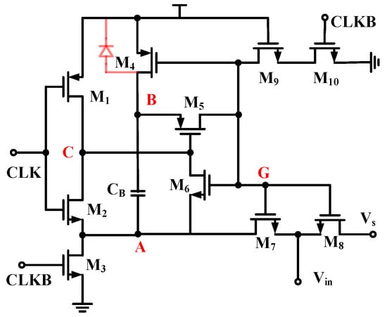 The M8 in the sampling stage keeps the gate–source voltage difference constant while the gate voltage varies with the input signal. Due to the parasitic capacitance Cg in M8, the on-state impedance cannot be completely independent of the input signal; the design ensures that Cg is much smaller than CB. In addition, the voltage of point B can reach a maximum of 2VDD (Vin = VDD), If the transistor M4 substrate is connected to VDD via the usual method, there will be a forward diode between point B and VDD, which results in a maximum point B voltage of only 0.7 V + VDD. The transistor M4 substrate needs to be shorted with point B to avoid voltage clamping.