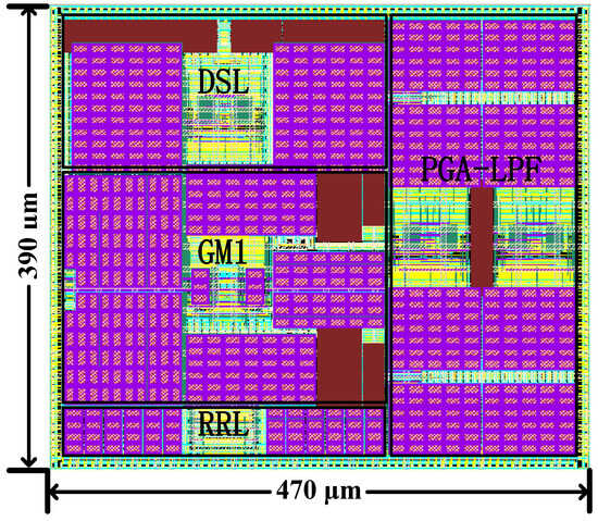 Figure 13 shows the layout design of the proposed AFE, which includes GM1, DSL, RRL and PGA-LPF. It is implemented using the UMC 40 nm CMOS process with an area of 0.18 mm2. The power consumption after the layout simulation is 8.94 μW at 1.2 V supply.