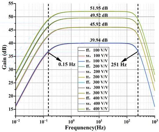 The overall AFE amplitude–frequency characteristic simulation results are shown in Figure 14. The switching configuration through the PGA-LPF module enables the 100 V/V–400 V/V gain to be adjustable. The gains in the mid-frequency bandwidth are 39.94 dB, 45.92 dB, 49.52 dB, and 51.95 dB, respectively. The high-pass characteristics are determined by the DSL loop with a high-pass cutoff frequency of 0.15 Hz, and the low-pass characteristics are determined by the PGA-LPF module with a low-pass cutoff frequency of 251 Hz.