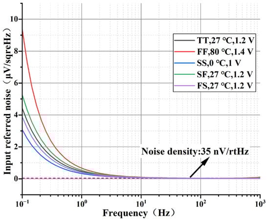 The equivalent input noise of the analog front-end circuit under different Process Voltage Temperature (PVT) conditions is given in Figure 15. Comparing the system noise under different process angles, the circuit equivalent input noise curve does not change much over the frequency range of the signal of interest. The input noise is integrated across the frequency interval ranging from 0.5 Hz to 1 kHz. The results of the integrated noise are presented in Table 1 andare approximately 1 μVrms. The simulation results show that, with the chopping frequency employed and the corner frequency depicted in Figure 15, the chopper stabilization suppresses 1/f noise.