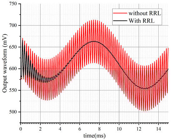 Simulation verification was conducted on the RRL function by adding a 1 mV offset voltage at the output end of the main amplifier for transient simulation. Figure 17 shows the output transient waveforms with and without the RRL. From the figure, it can be seen that the RRL has a significant effect on the elimination of output ripple. After about 5 ms of stabilization, the ripple is suppressed and will not affect the output signal. The residual high-frequency ripple will be eliminated a second time after passing through the next stage of filtering.