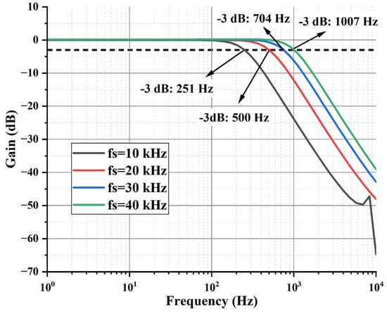 The amplitude and frequency response of the PGA-LPF module is simulated in Figure 18. When the sampling frequency fs is taken as 10 kHz, 20 kHz, 30 kHz, and 40 kHz, it can be seen that the bandwidth of the PGA-LPF module is about 251 Hz, 500 Hz, 704 Hz, and 1007 Hz, respectively. This is slightly different from the design value due to the effect of parasitic capacitance.